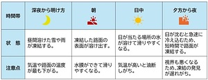 一日の路面凍結(アイスバーン)の変化と注意点を把握しておきましょう。(図2参照)