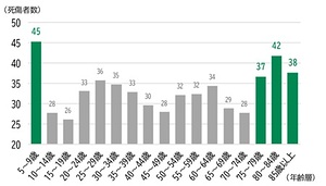 歩行中の交通事故死傷者数を年齢層別に見てみると、5~9歳のこどもと75歳以上の高齢者が多い状況です。